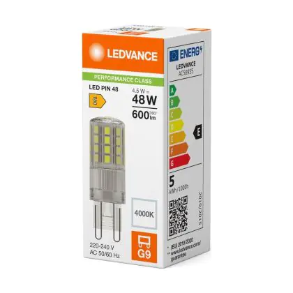 Die Ledvance LED Pin G9 Klar 4.5W 600lm - 840 Kaltweiß | Ersatz Für 48W ist eine effiziente G9 LED-Lampe und der perfekte Ersatz für Ihre konventionelle Halogenlampe mit W und einem G9-Sockel. Die Stifte haben einen Abstand von 9 mm. Zudem strahlt das Produkt Licht in der Farbtemperatur 4000K - Kaltweiß aus und punktet durch eine lange Lebensdauer.