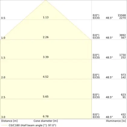 Beispiel: Wird eine Lampe mit einem Abstrahlwinkel von 60 Grad an der Decke (2,5 m Höhe) angebracht, erzeugt sie einen Lichtkegel von 2,9 Metern Durchmesser. Hat die Lampe hingegen einen Abstrahlwinkel von 120 Grad, beträgt der Lichtkegel 8,7 Meter im Durchmesser. |
