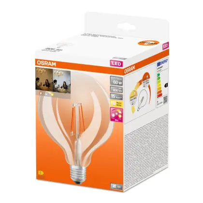 Die Osram SuperStar LED E27 Globe 125mm Fadenlampe Klar 7W 806lm - 822-827 Dim to Warm | Dimmbar - Ersatz für 60W ist eine effiziente E27 LED-Lampe mit Retrodesign und der perfekte Ersatz für Ihre konventionellen 60W Lampen mit E27. Zudem strahlt sie Licht in der Farbtemperatur 2200K - 2700K Dim To Warm aus und punktet durch eine lange Lebensdauer.