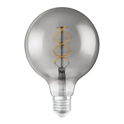 Die Osram Vintage 1906 LED E27 Globe Fadenlampe Smoke 125mm 5W 140lm - 818 Extra Warmweiß | Ersatz für 15W ist eine effiziente E27 LED-Lampe mit Retrodesign und der perfekte Ersatz für Ihre konventionellen 15W Lampen mit E27. Zudem strahlt sie Licht in der Farbtemperatur 1800K - Extra Warmweiß aus und punktet durch eine lange Lebensdauer.